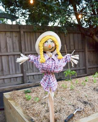 The other big project was the veggie patch which needed a not-so-scary scarecrow. “The scarecrow was a great one to make because we were able to use left over dowel or garden stakes, baby clothes (size 1 or 2 is perfect) and a hat that didn’t fit anymore,” she said.